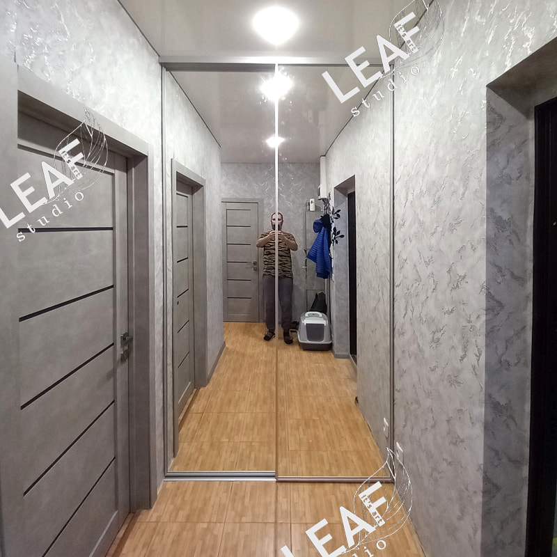 Встроенная гардеробная с дверьми-купе. Тонкий алюминиевый профиль, толстая противоосколочная пленка, вечные ролики с подшипником, качественное ровное зеркало.