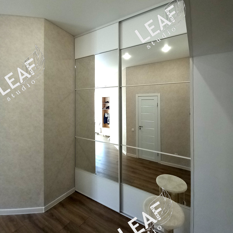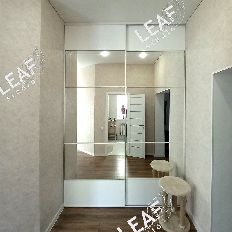 Гардеробная. Размеры 1980*1200*3050мм. Тонкий усиленный белый профиль, качественное зеркало, толстая противоосколочная пленка, усиленные бесшумные ролики. Двери высотой более 3 метров и шириной метр, из-за этого они на порядок дороже обычных.