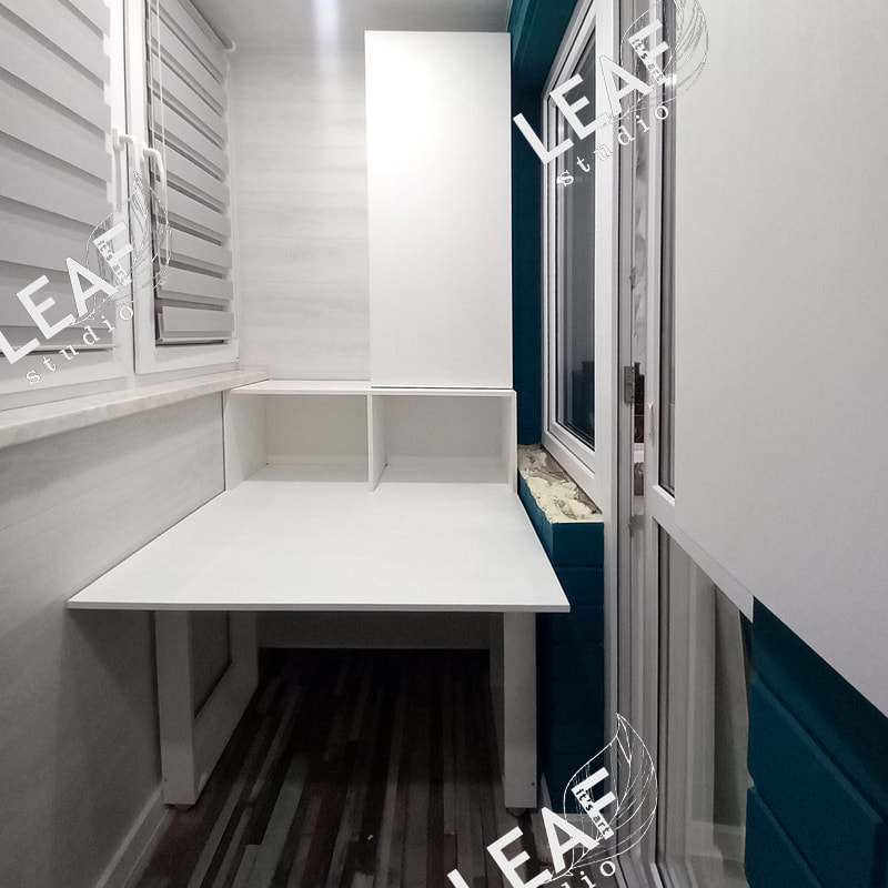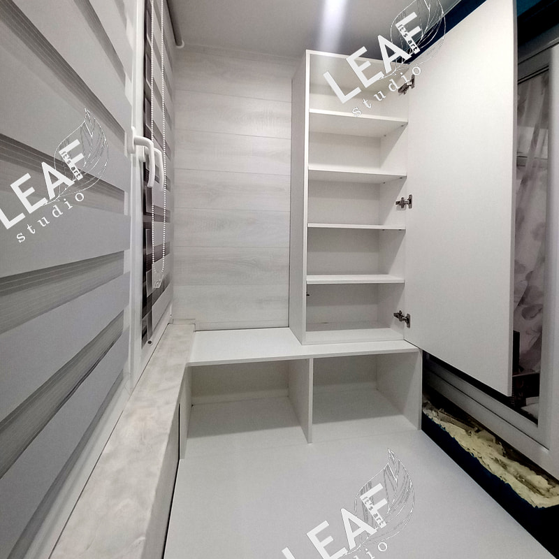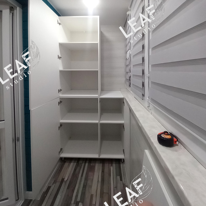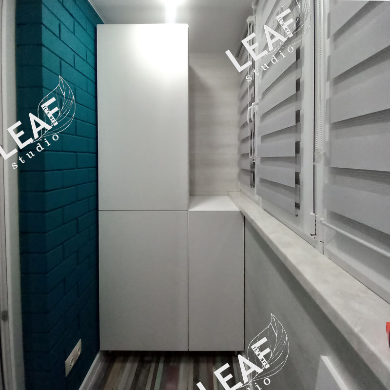 Шкафы на балкон, один для хранения, один с раздвижным столом для шитья.