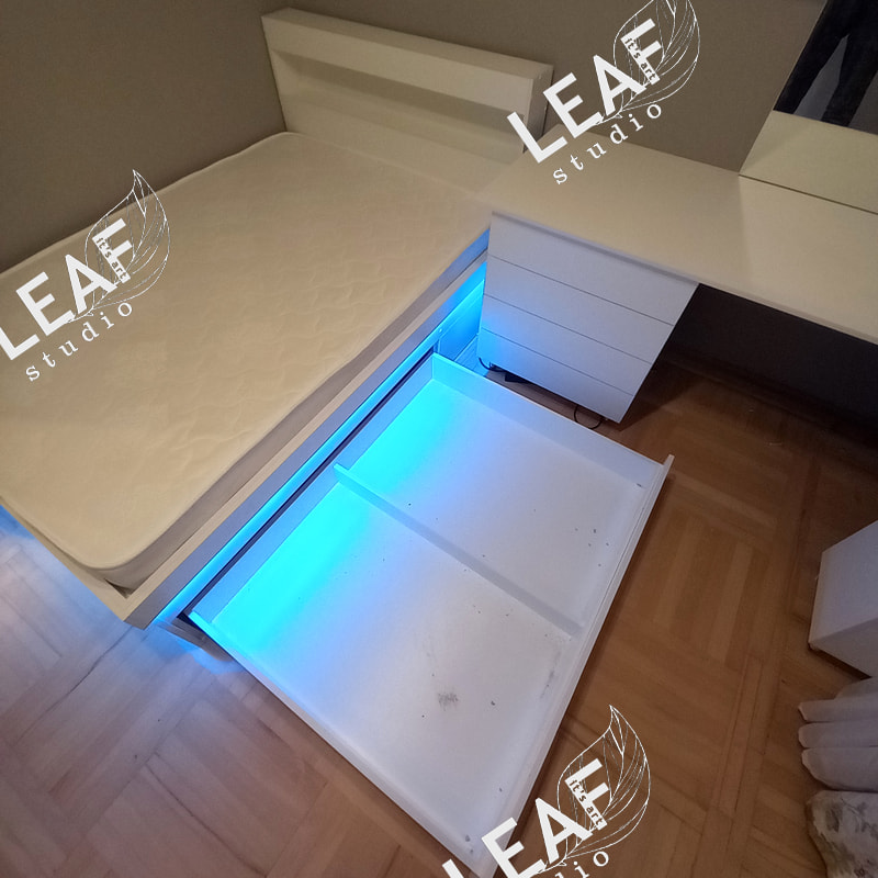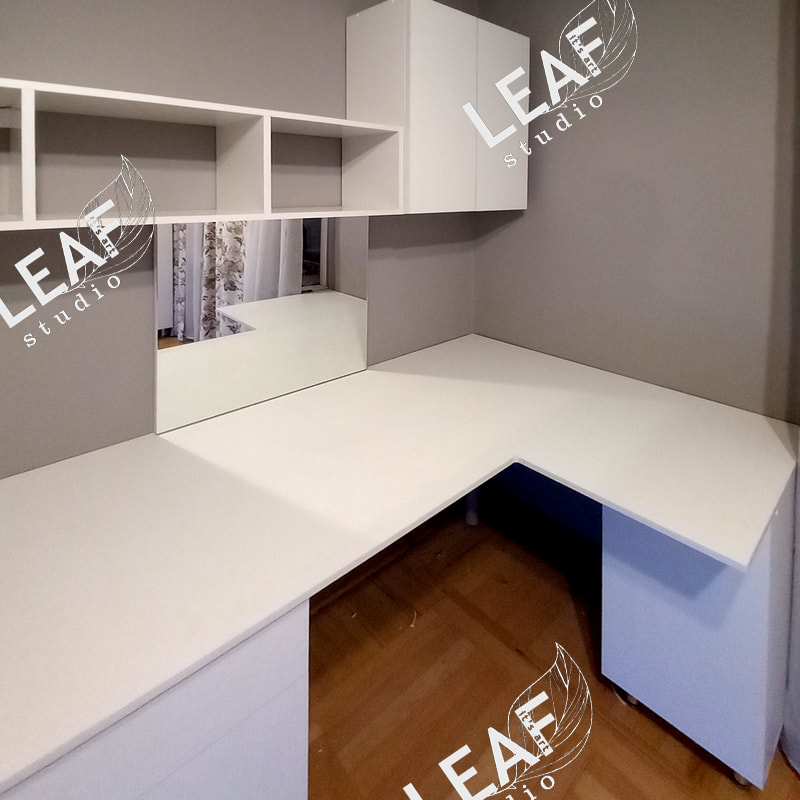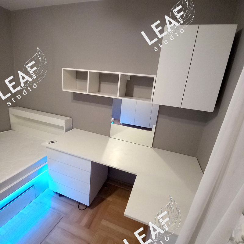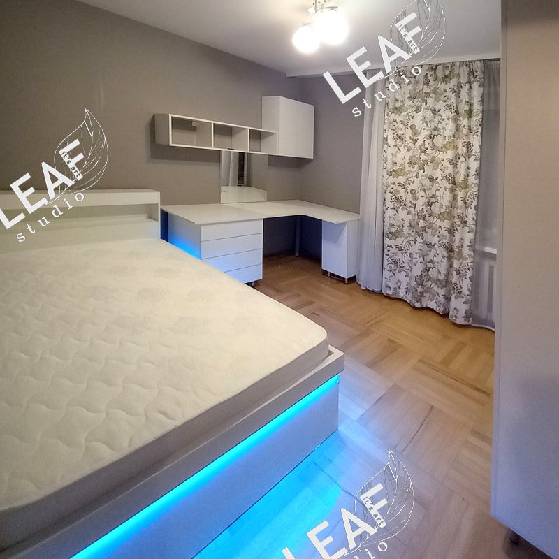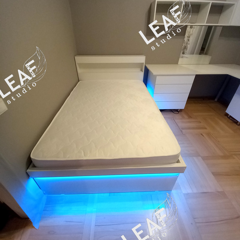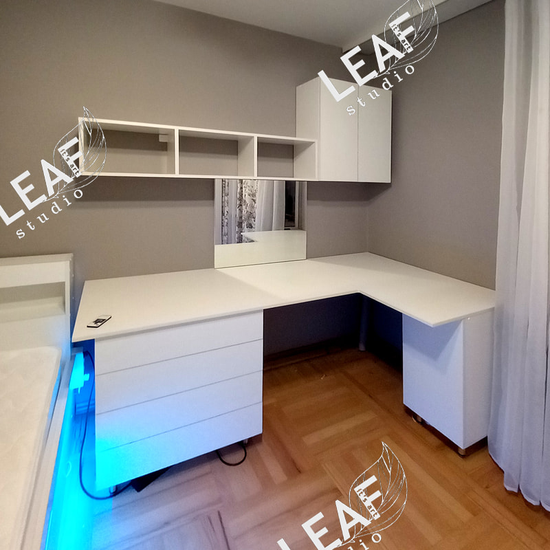 Кровать с подсветкой 1900*1200мм, угловой стол 1750*1000мм с тумбами и зеркалом, навесные полки, шкаф 3-х дверный 1500*2300*520мм.
