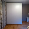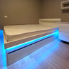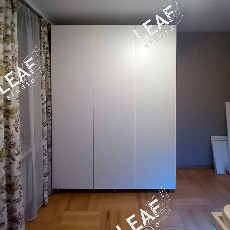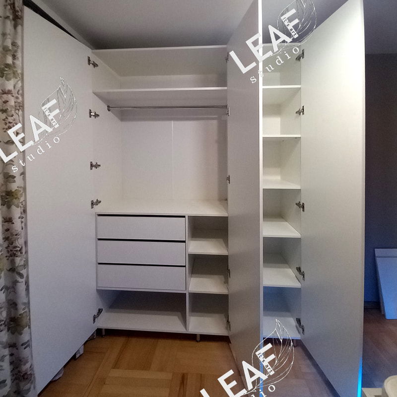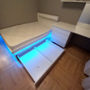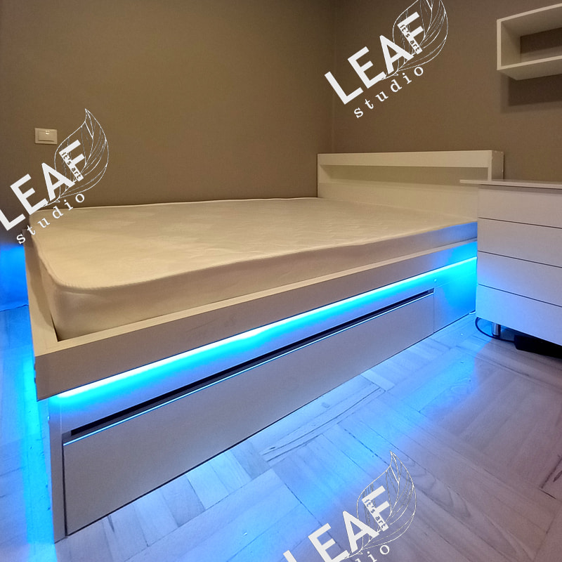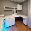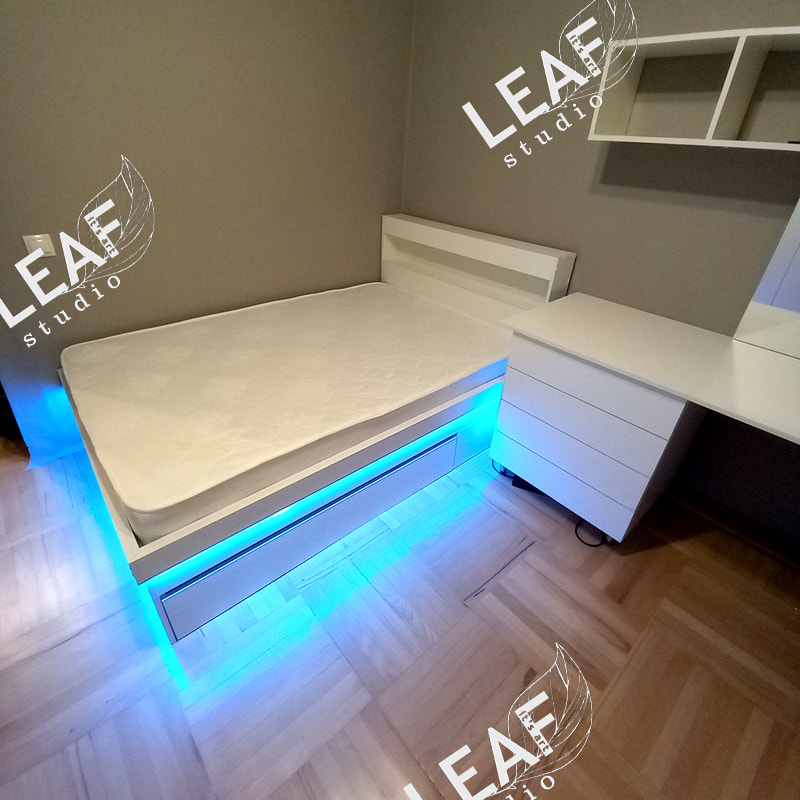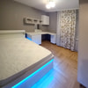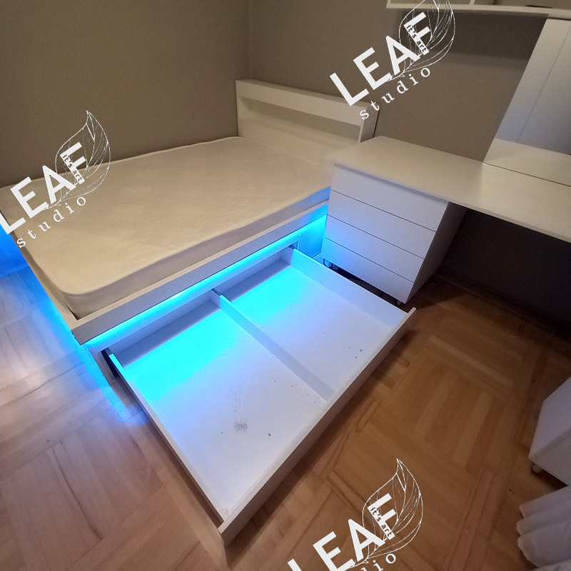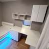 Кровать с подсветкой 1900*1200мм, угловой стол 1750*1000мм с тумбами и зеркалом, навесные полки, шкаф 3-х дверный 1500*2300*520мм.