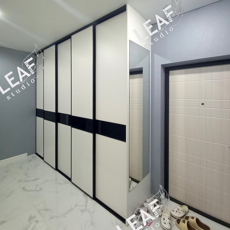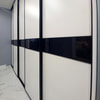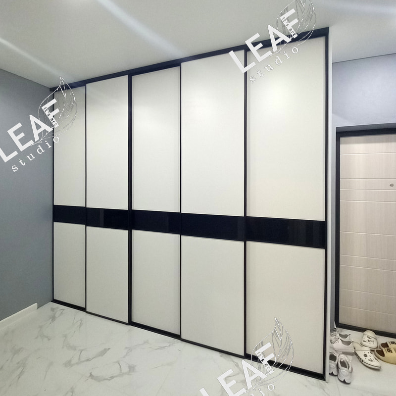Шкаф-купе 5 дверный. Вставка МДФ + черное стекло, делители. Усиленный профиль, усиленные мягкие ролики.