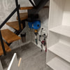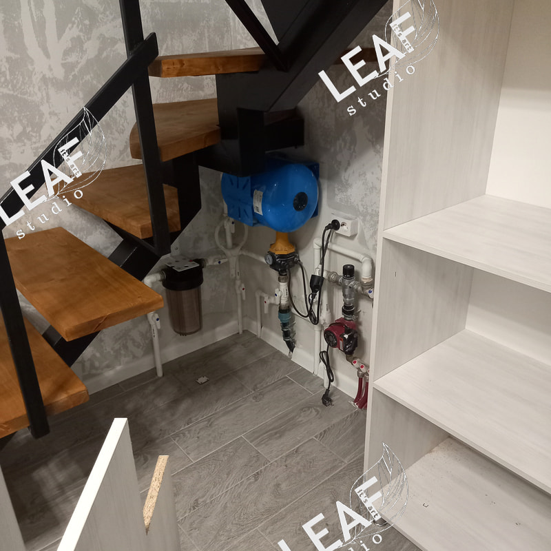 Шкаф под лестницей. Материал ЛДСП Северное дерево, ручки GTV, доводчики. Состоит из 3 секций, одна из них это собственно шкаф, вторая и третья выдвигаются на роликах. Стояла задача закрыть все коммуникации, сохранив к ним доступ. Работу сильно осложняла геометрия лестницы, и то что она металлическая, с бетонными не намного, но проще.